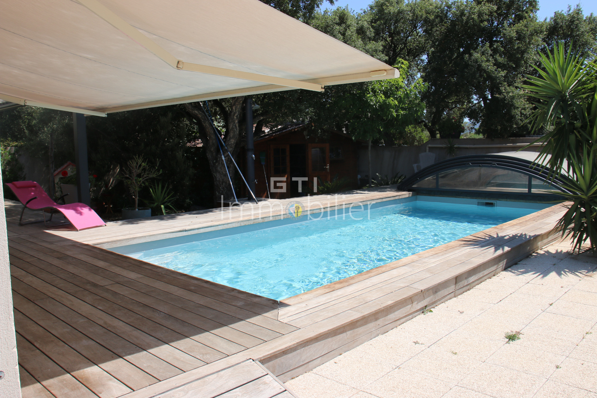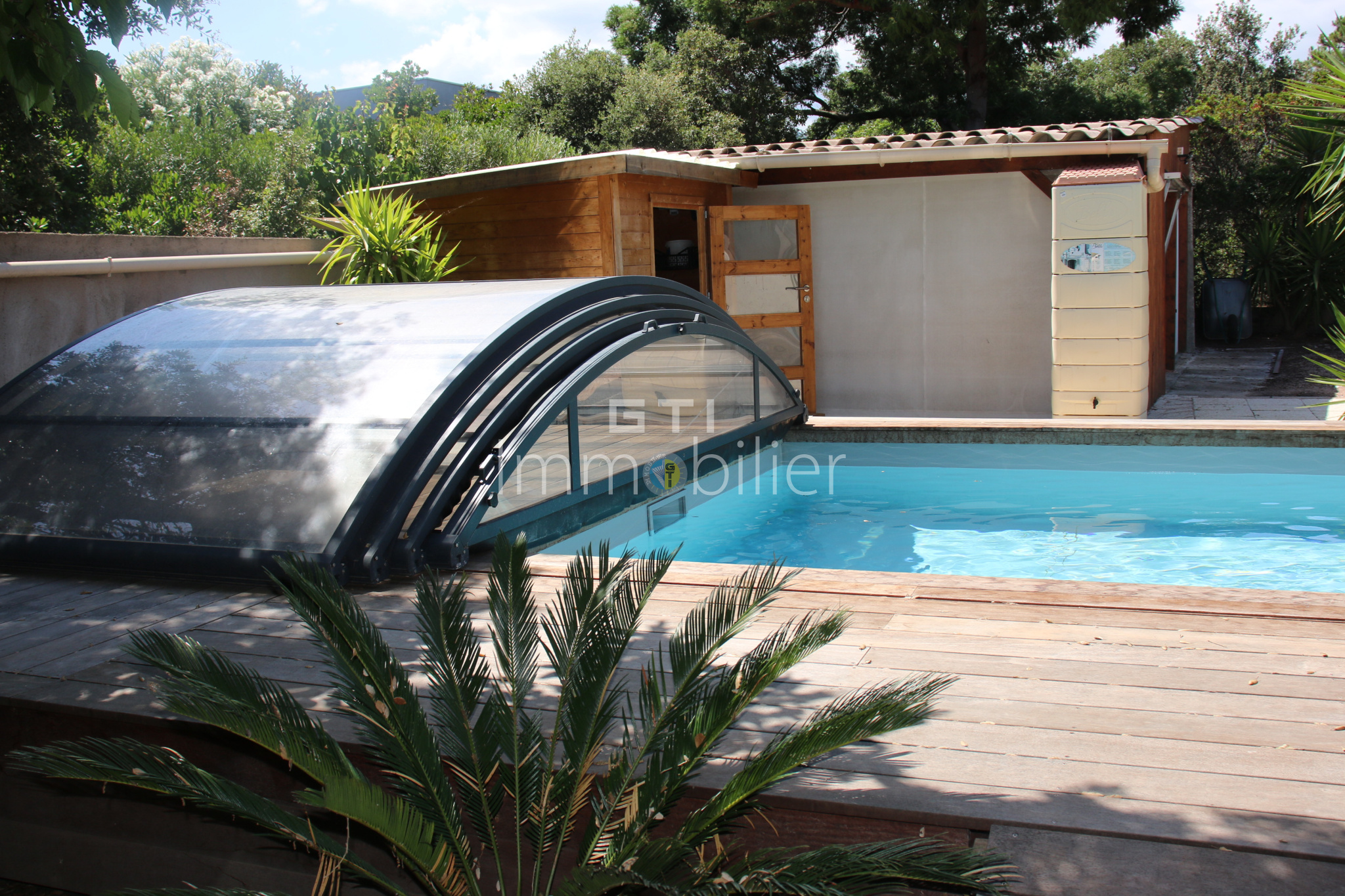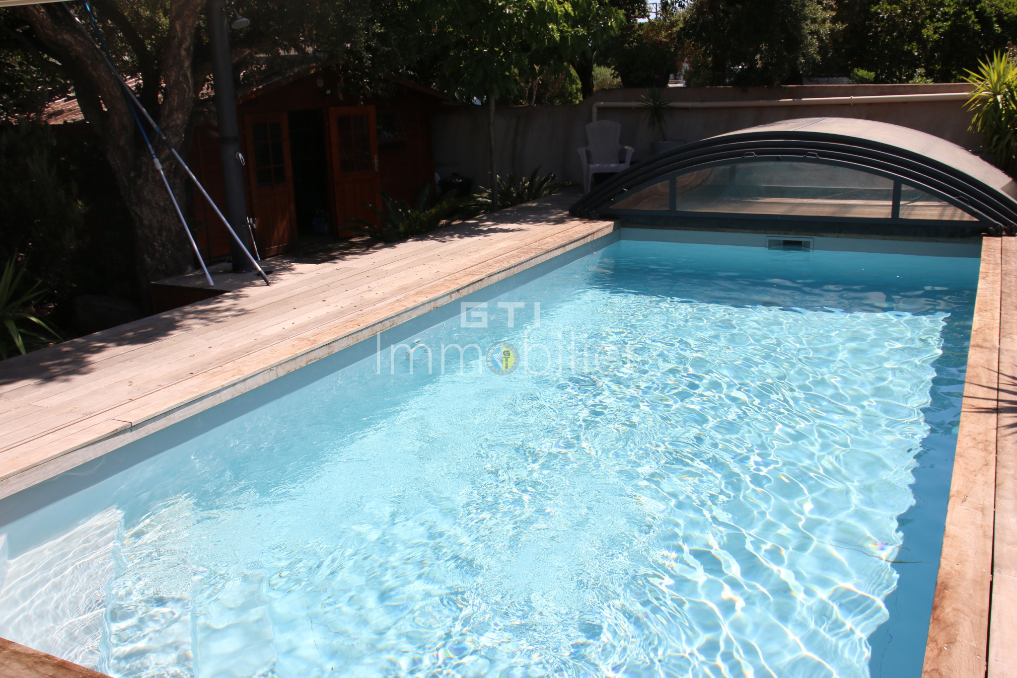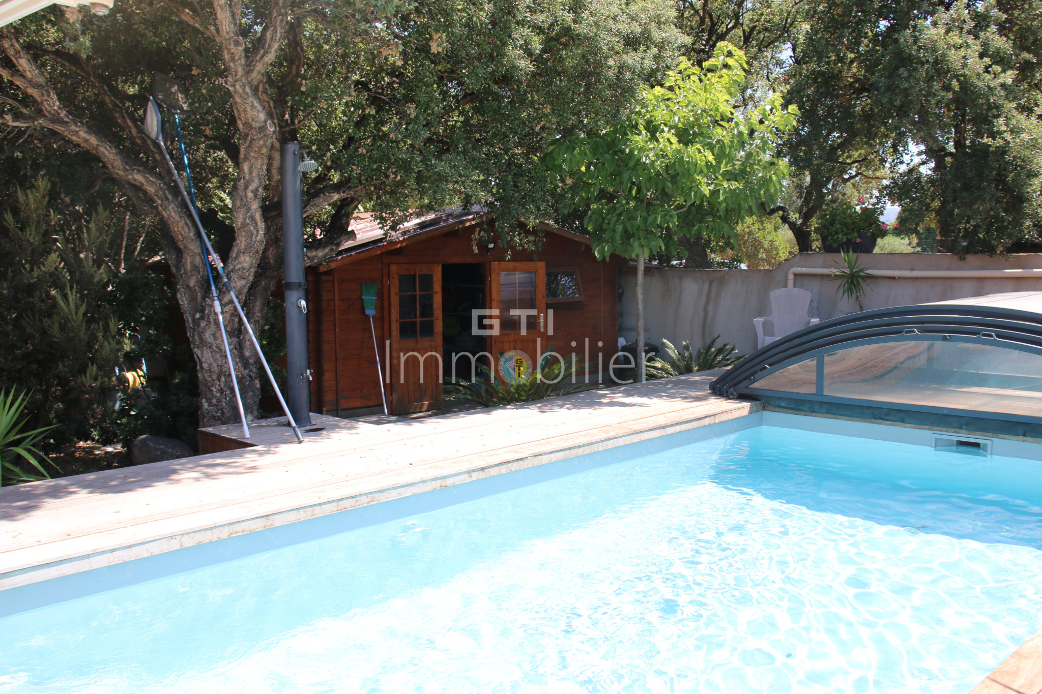 La piscine de 8.50m x4 m est protégée par un abris coulissant. Un chalet en bois d'environ 20m2 sert de buanderie et d'atelier.